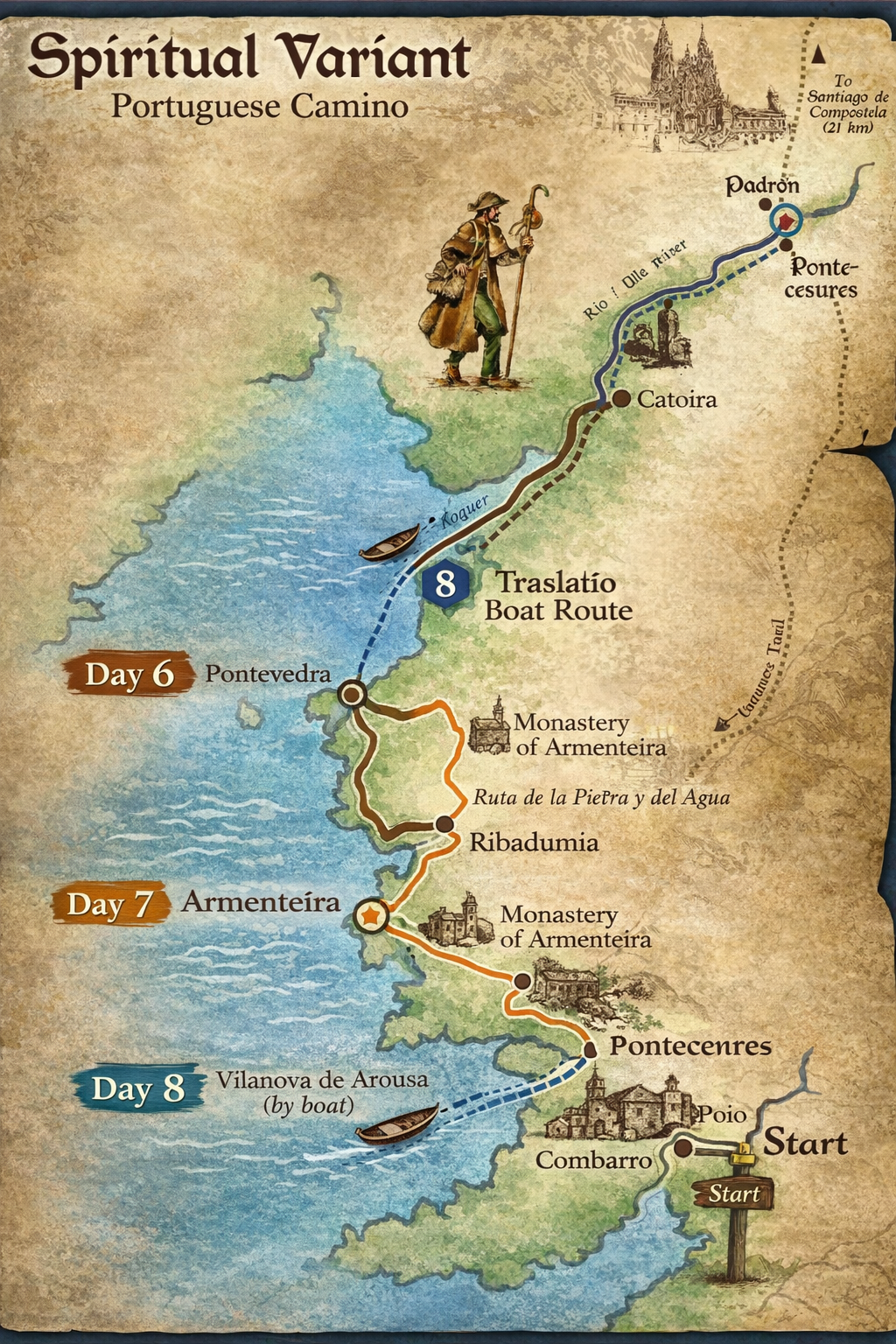 A signature feature of this variant: a boat journey (“Traslatio”) associated with the Spiritual Variant, linking the coast back toward the inland Camino. We travel by boat to Pontecesures, then walk a short stage to Padrón. Overnight in Padrón. - 13/05 – Day 9 PADRÓN → SANTIAGO DE COMPOSTELA (STAGE) • 25 km
